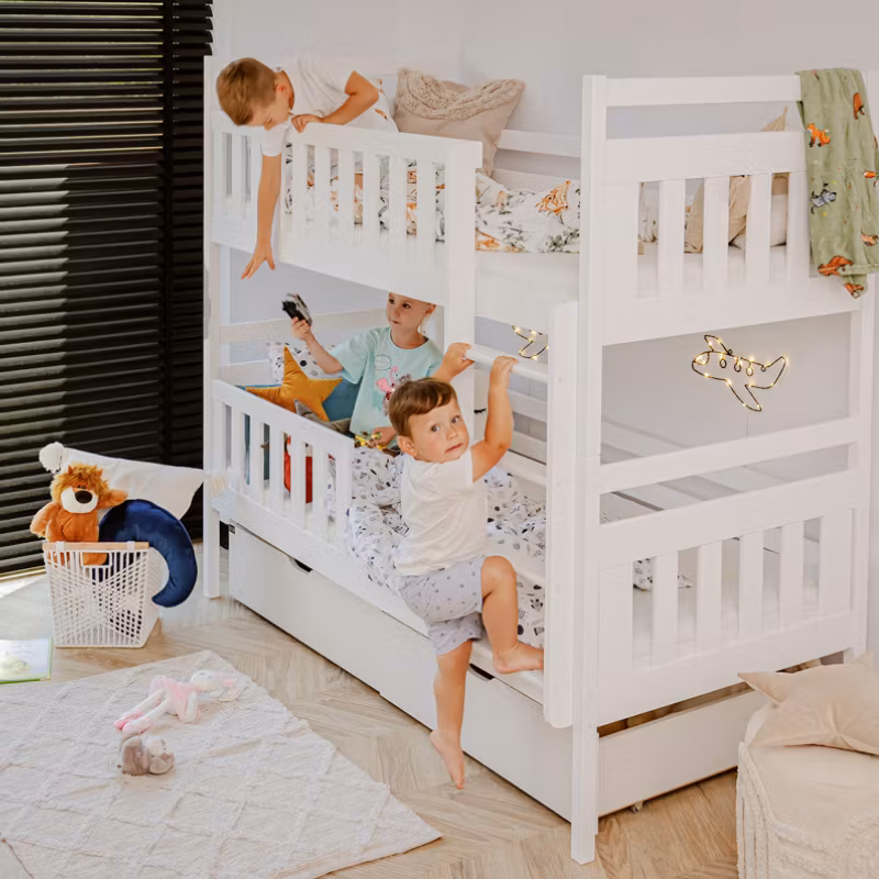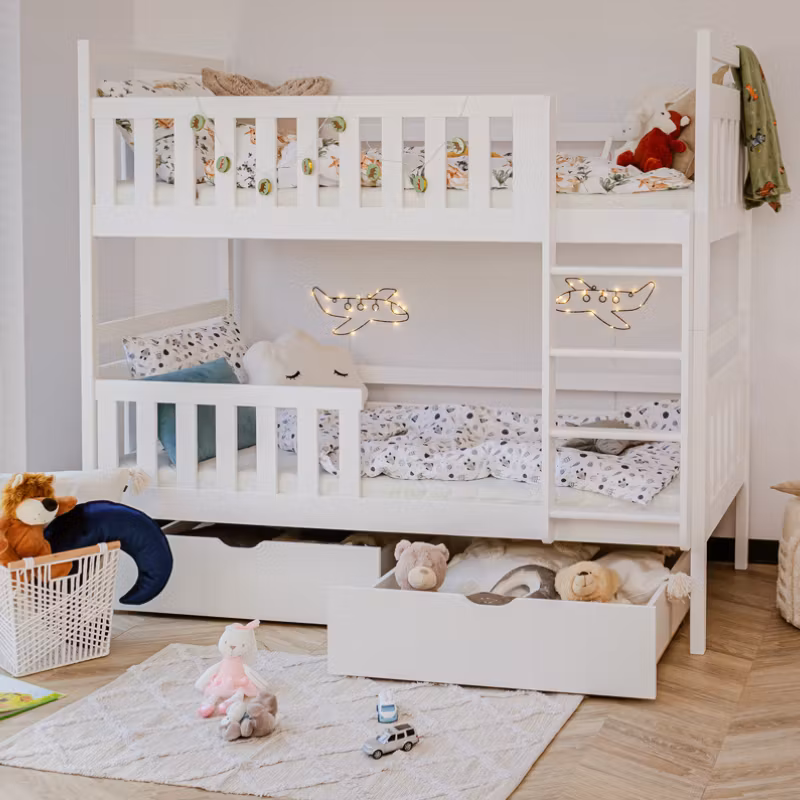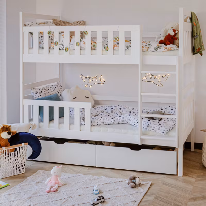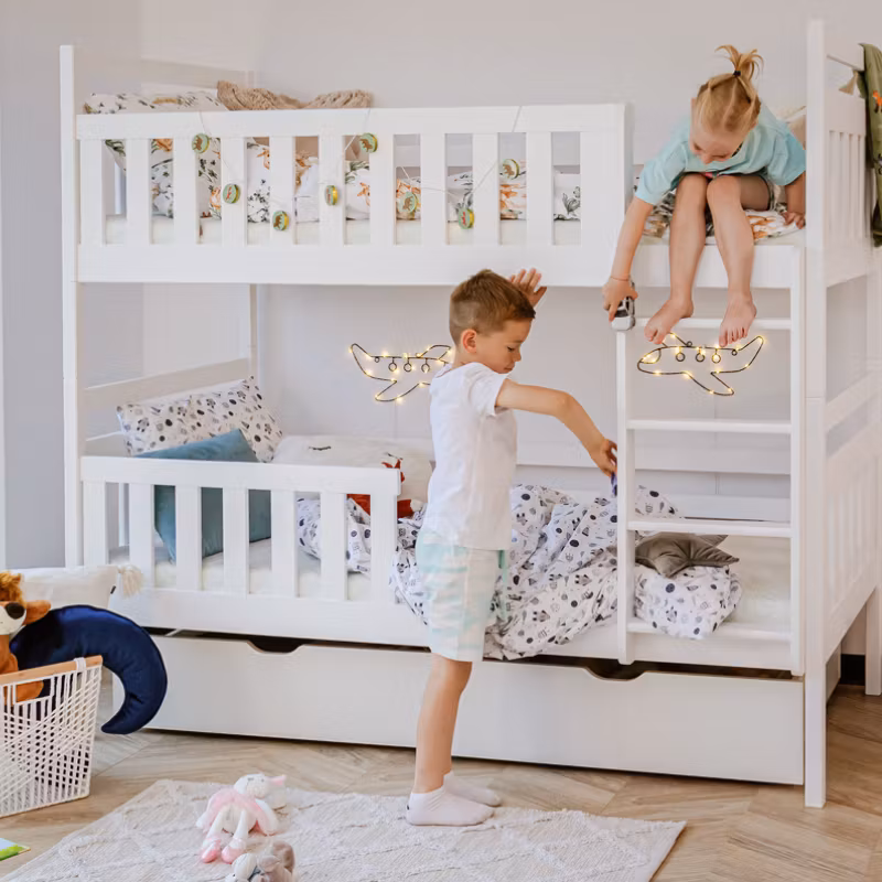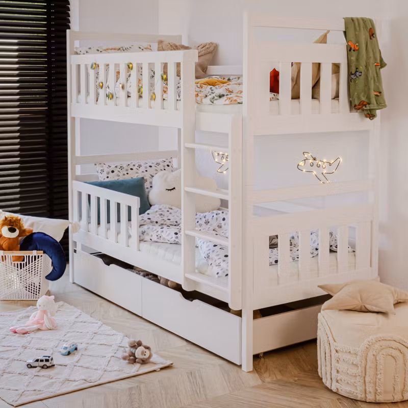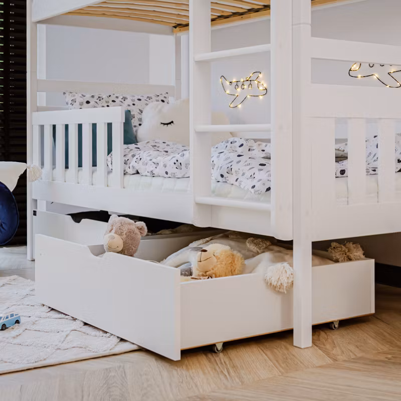 På vår fine køyeseng Misty har vi tenkt nøye gjennom for å optimalisere gulvplassen på barnerommet. Vi lover at sengen vil bli ditt barns favoritt, og ikke bare for å sove i, da den med enkle midler kan bli et virkelig koselig hjørne. Mange dekorerer med senghimmeler, vimpler eller lyslenker, bare din kreativitet setter grenser.