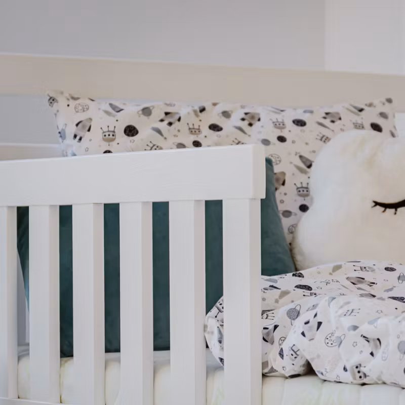 Sengene produseres i henhold til standarden EN-747-1: 2012 + A1: 2015 på vår fabrikk i Europa, som har de høyeste sikkerhetsstandardene for produksjon av barnesenger, og kontrollerer hvert trinn fra tømmeret kommer inn i fabrikken til et ferdig produkt forlater. Sengene blir lakkert tre ganger med økologisk, miljøvennlig og vannbasert maling som følger normen EN 71-3:2019.