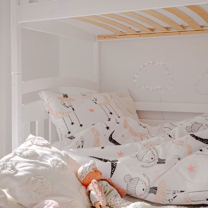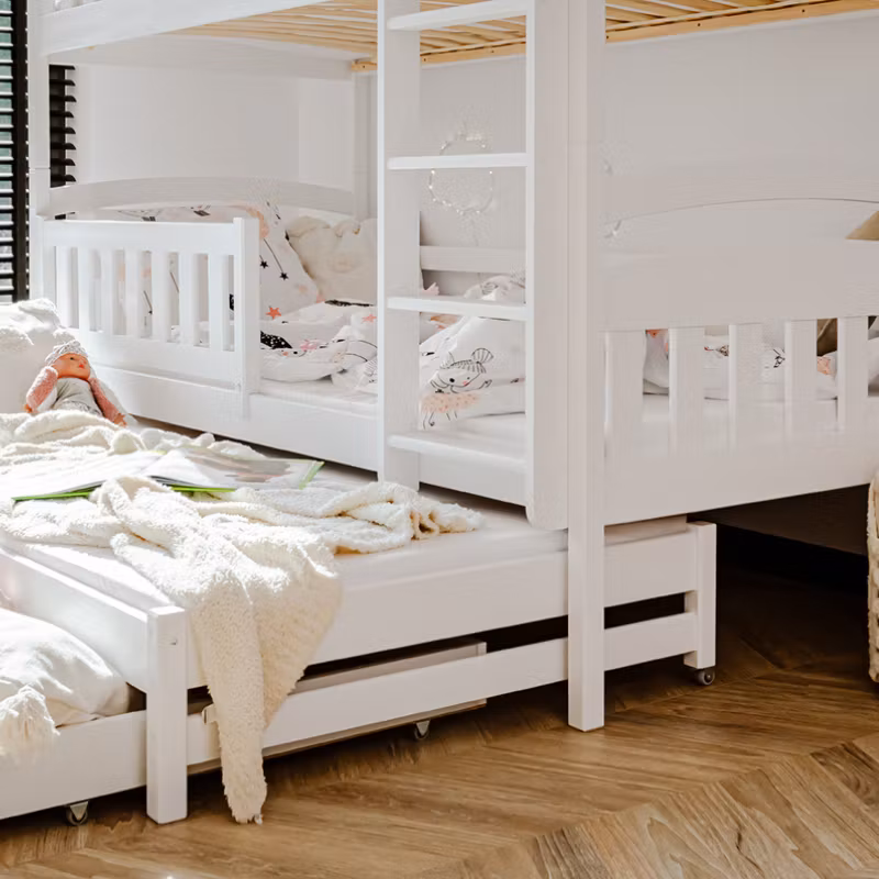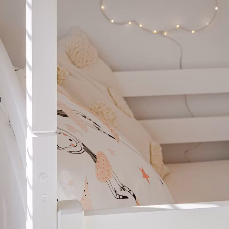 På vår fine syskonseng Betty har vi tenkt nøye gjennom for å optimalisere gulvplassen på barnerommet. Vi lover at sengen vil bli dine barns favoritt, og ikke bare for å sove i, da den med enkle midler kan bli et virkelig koselig sted å være. Mange dekorerer med senghimmeler, vimpler eller lyslenker, bare din kreativitet setter grenser.